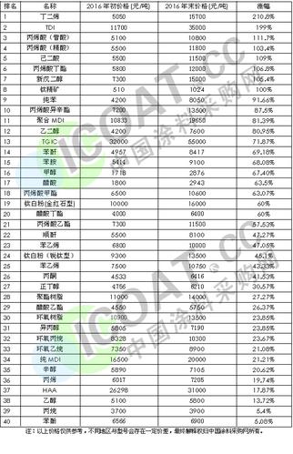 丁二烯2016年初價(jià)格基本在5000元/噸左右,而目前價(jià)格基本在15700元/噸左右,其以210.8%位居榜首,TDI以199%的漲幅名列第二。丙烯酸及酯后來(lái)居上,一年中價(jià)格走勢(shì)平穩(wěn),最后一季度窮追猛趕漲價(jià)潮,最終以全年111%的漲幅,位列三甲。鈦白粉2016年雖然經(jīng)過(guò)十幾輪的漲潮助推,但是卻未能進(jìn)入前十,只能以60%的漲幅位列第19名,新戊二醇與鈦精礦分別以105.4%與100%的漲幅進(jìn)入“十強(qiáng)”。